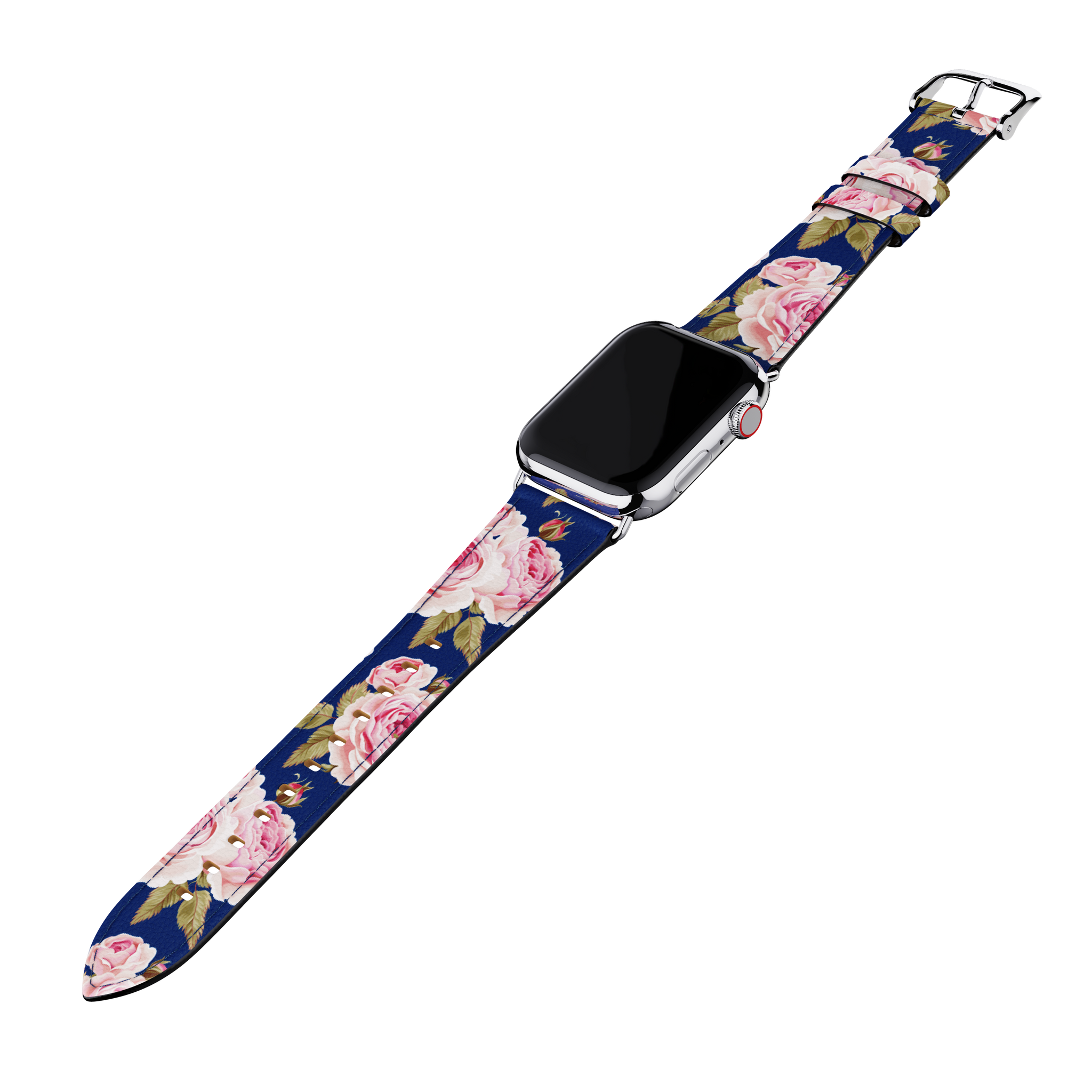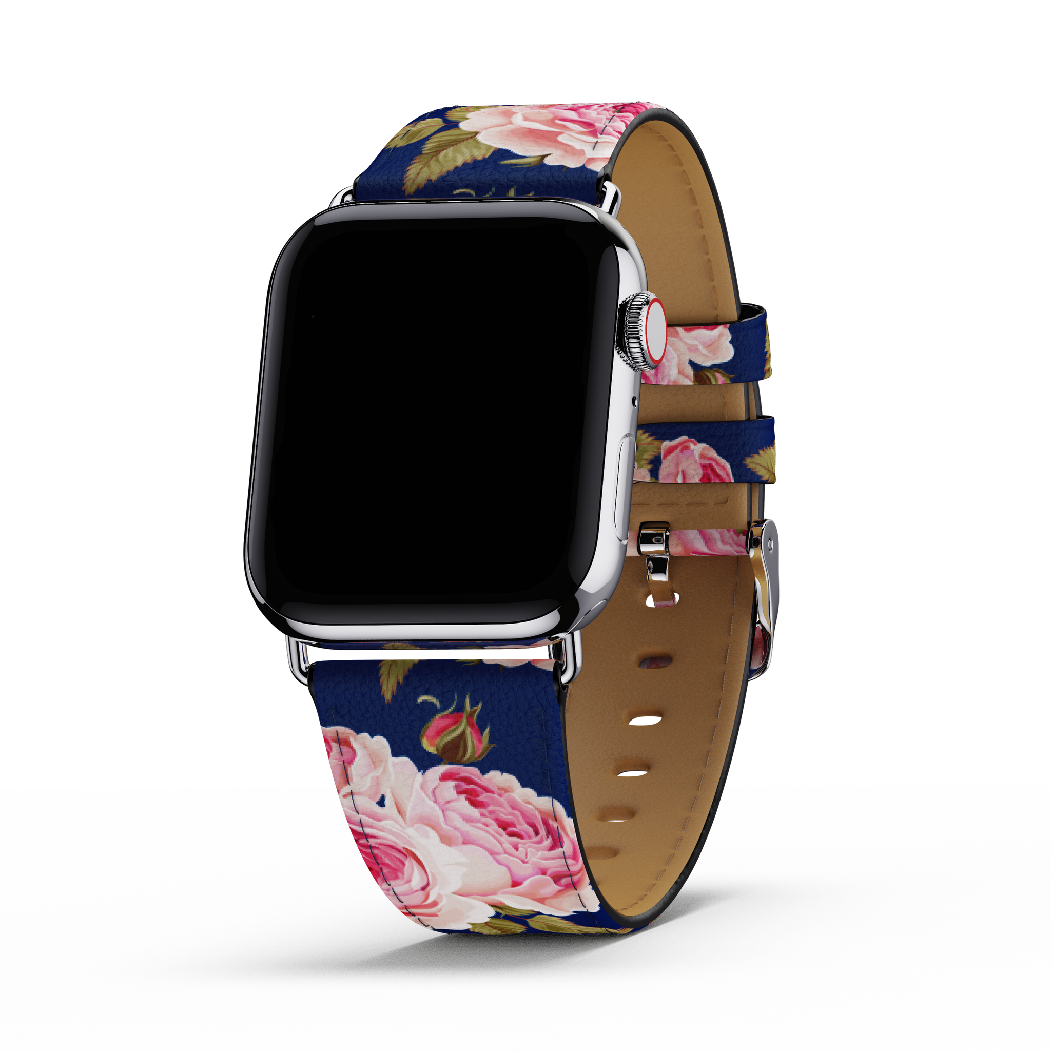 Add the perfect pretty touch to your Apple watch with the new Navy Floral band. Made with durable vegan leather on the outside and soft genuine leather on the inside, each band comes with a silver “Wildflower” embossed clasp. Our bands are available in two sizes and are compatible with Apple Watch Series 3, 4, and 5.